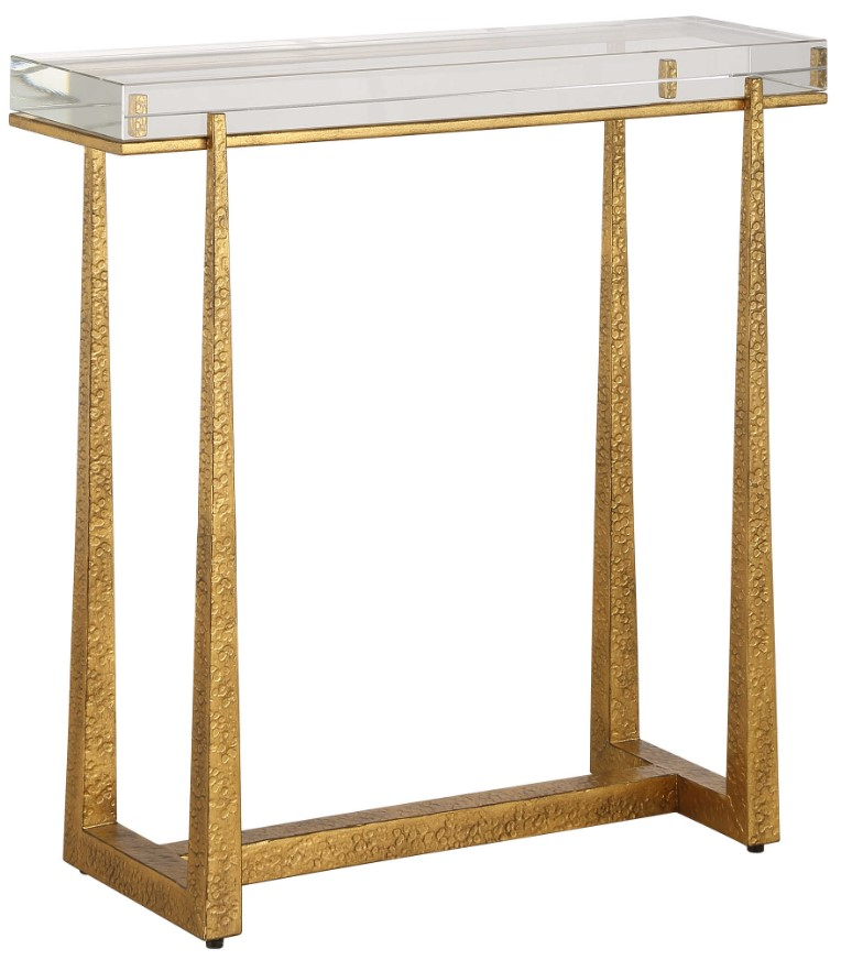 This elegant accent table adds a touch of luxury to any room. The textured antique gold finish iron legs perfectly support and accentuate the thick crystal top, creating a stunning piece that combines style and functionality for your home decor.Read More
