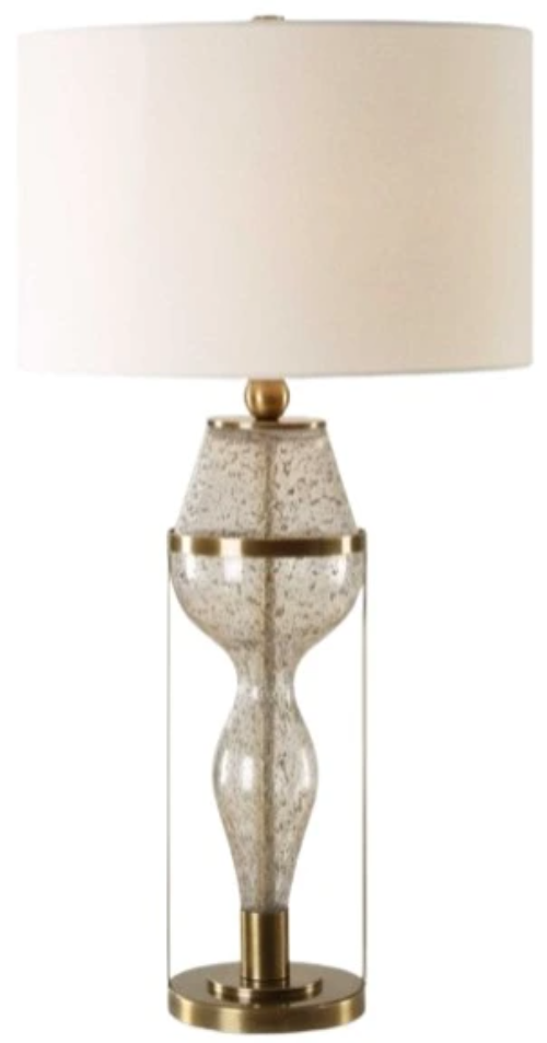 Featuring a captivating hourglass silhouette, this lamp features a seeded glass base with gray flecks, suspended in an iron support finished in a rich plated antiqued brass. The round hardback drum shade is covered in a crisp white linen fabric.Read More