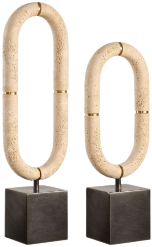 Elevate your space with our set of two sculptures featuring oval-shaped, cast ivory man-made stone, resembling the timeless beauty of travertine, adorned with gold band accents and elevated atop dark bronze bases. Each piece showcases beauty and rich texture, offering a harmonious blend of organic elegance and modern design.Read More