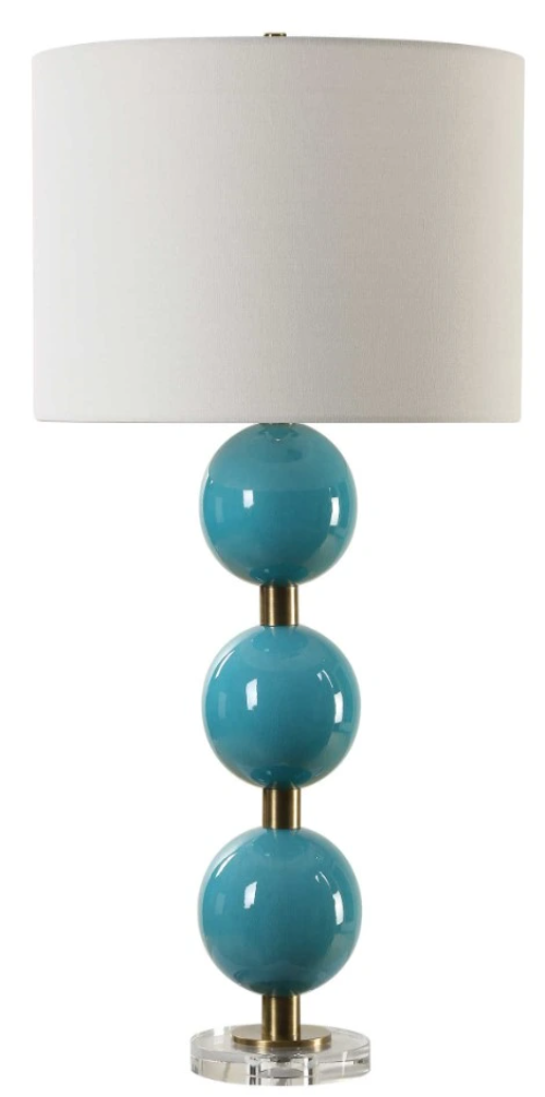 Elevate your space with our captivating table lamp featuring stacked ceramic spheres adorned in a crackled turquoise blue glaze. Enhanced with plated antique brass details and a thick crystal foot, it exudes timeless elegance and artistic charm. The round hardback drum shade is a crisp white linen fabric.Read More