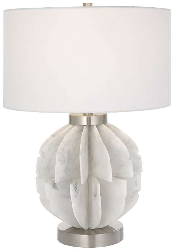 This contemporary table lamp features thin stacked blades that create an organic sphere finished in a white marble look accented by plated brushed nickel accents. The lamp is paired with a white fabric drum shade.Read More
