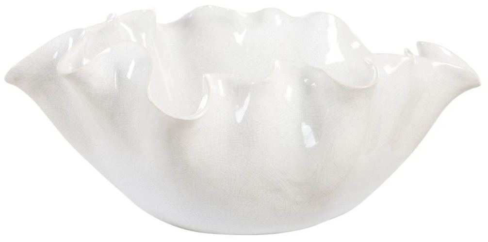 This elegant ceramic bowl features a stunning ruffled edge design, evoking the delicate shape of a blooming flower. Its soft white glaze with a subtle crackle finish adds texture and sophistication, making it an ideal statement piece for any modern or classic decor. Perfect for displaying as a centerpiece or for functional use.Read More