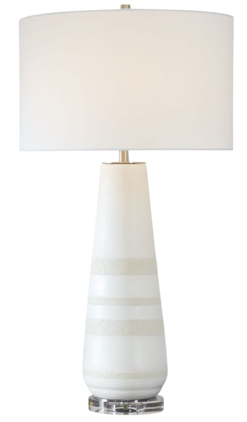 Showcasing a crackled ivory ceramic base with heavily textured dove gray bands for a touch of earthy elegance. Resting on a thick crystal foot and accented with brushed plated nickel finishes, this lamp brings a serene sophistication to any room.Read More