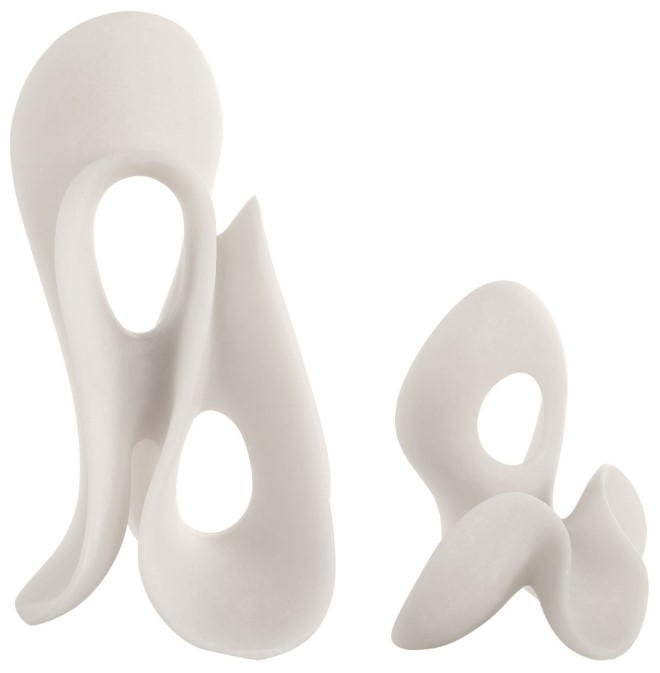 This set of two sleek, minimalist scuptures features smooth, flowing forms with elegant curves and hollowed-out sections. Crafted in a matte white man-made stone that accurately replicating the look of Thassos marble, these pieces add a sophisticated and modern touch to any interior, evoking a sense of serenity and abstract beauty.Read More