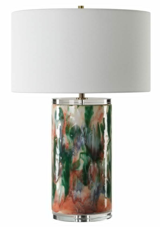 This unique ceramic lamp is finished like an abstract piece of art featuring shades of luscious green, hints of blues, pops of salmon on a off white background, paired with thick crystal details and plated brass accents. A round drum shade covered in a crisp white linen fabric completes piece.Read More