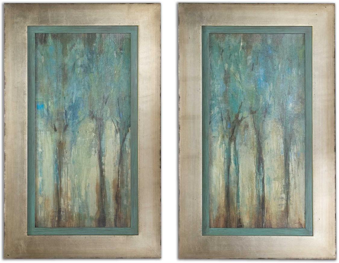 These Modern, Oil Reproduction Landscapes Feature A Hand Applied, Dabbed Finish. Muted Shades Of Blue, Green, And Beige Create Abstract Detailing. Large, Silver Leaf Frames With A Heavy Champagne Wash Have Slightly Distressed Edges That Are Accented In A Warm Sepia Tone. A Muted, Aqua Inner Lip With A Heavy Charcoal Glaze Completes This Set Of Artwork.