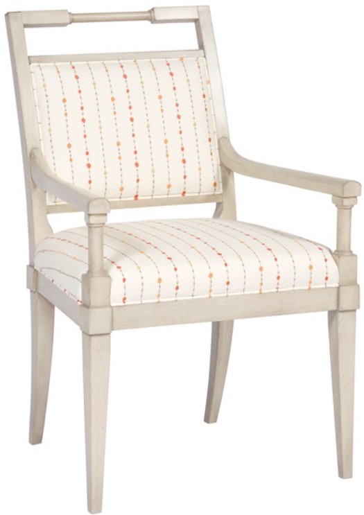 This Continental neoclassical Maria Dining Chair uses simplified, stylized design elements. The plain exposed frame has a rectangular upholstered panel back under a floating top rail with a centerhand pull. Slightly flared arms extend forward over simple turned front posts with a plain seat rail over square tapered legs.Read More